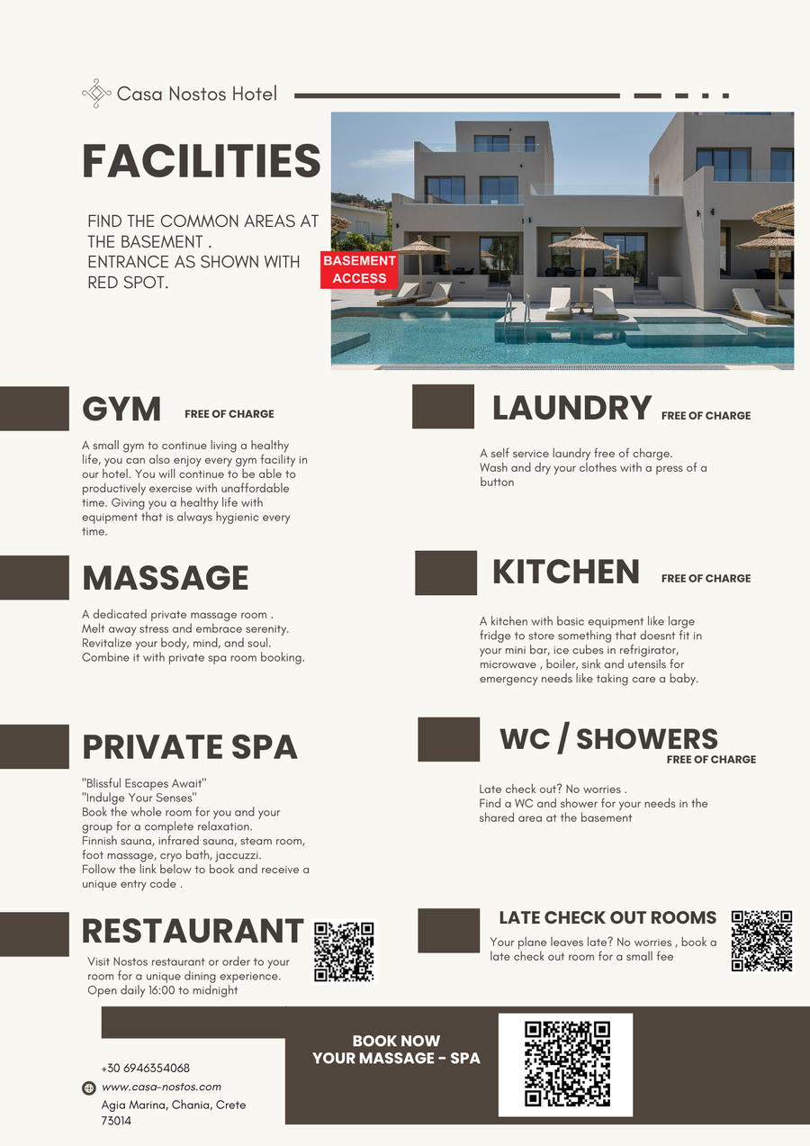Properties comes fully equipped with Wi-Fi, air conditioning, shared kitchen with modern appliances,shard laundry, mini gym, private outdoor spaces, and comfortable living areas. Casa Nostos also features a private pool, a charming garden and a restaurant on site.